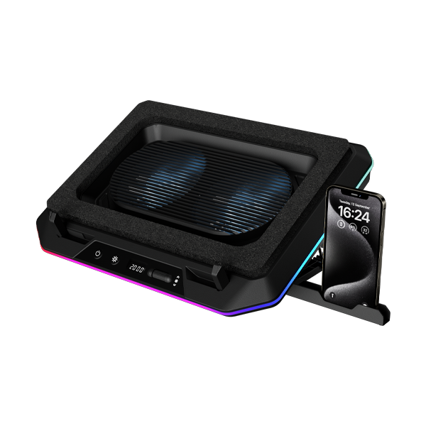 The AETHER P1 delivers powerful cooling with dual 135mm fans, enhanced by high-elasticity foam padding that improves airflow and heat dissipation while reducing noise. Its control panel allows fan speed and RGB lighting adjustments for a customized experience. Designed for 15″ to 19″ laptops, this cooling pad offers an ergonomic stand, stable stoppers, versatile connectivity with USB-A and Type-C ports, and an integrated phone stand for added convenience.